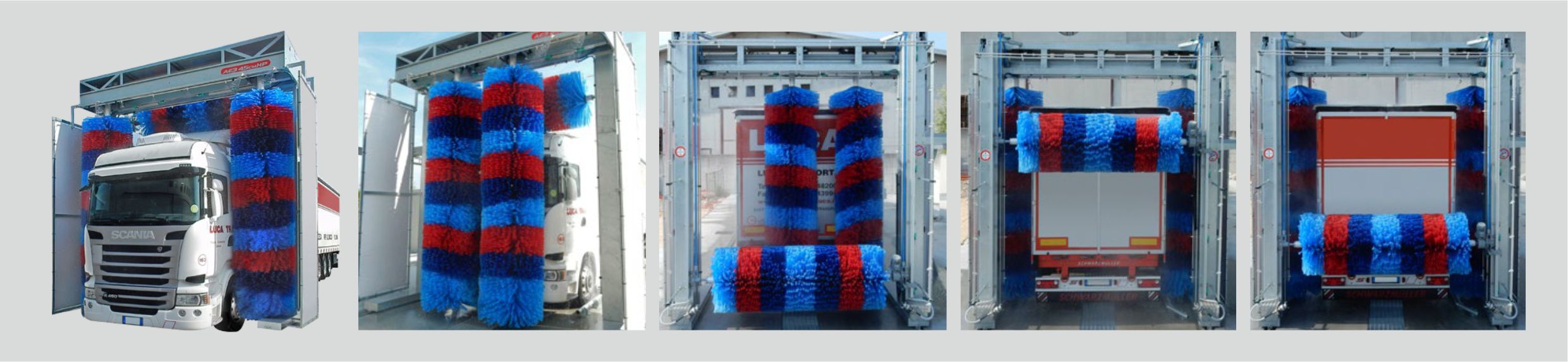 - CAMBUS – Un portal UNIC cu 2 perii motorizate (verticale) și 3 perii motorizate (2 verticale + 1 orizontală) disponibile în 3 modele cu înălțimea utilă de spălare de 4000, 4200 și 4500 mm.