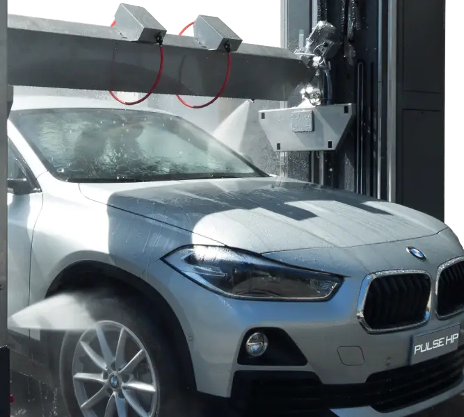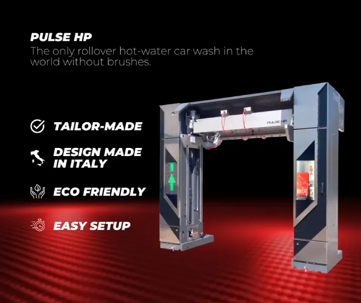 - PULSE HP este unic în lumea spălătoriei auto, deoarece este echipat cu jeturi de înaltă presiune „în mișcare” care utilizează detergent pudră cu apă fierbinte, sau detergent lichid cu apă rece, furnizat direct pe suprafața mașinii de spălat prin trei duze, dintre care două verticale și una orizontală la o presiune de aproximativ 120 bar.